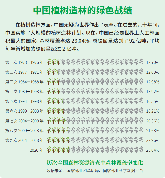 历次全国森林资源清查中森林覆盖率变化(数据来源:国家林业和草原局、国家林业科学数据平台)
