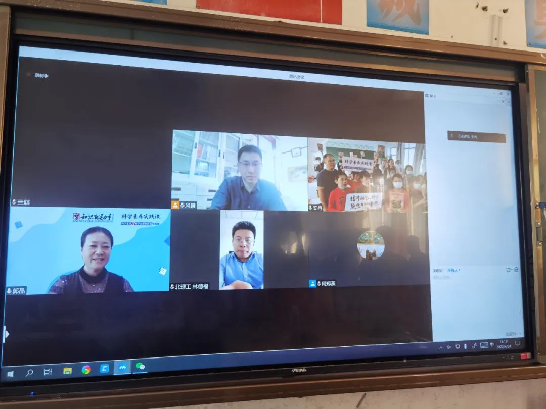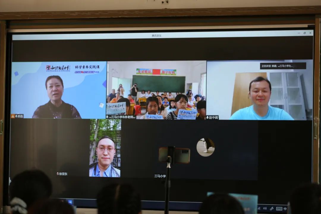 《知识就是力量》杂志社社长郭晶老师(左下)、北京理工大学教授、现任无人机自主控制技术北京市重点实验室主任、北京市国际科技合作基地主任林德福老师(中下)、中国科学院南京地质古生物研究所研究员、古无脊椎动物室主任王博老师(中上)与同学们线上见面交流