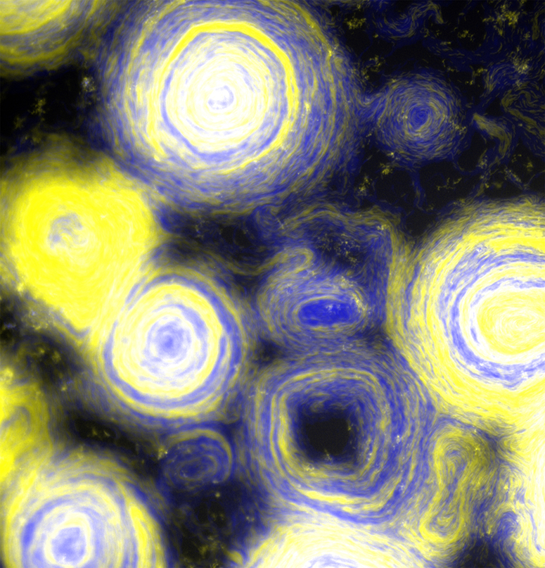 研究团队创造了几种过度表达这一特性的黄色黏球菌的变异株,发现它们在几小时内会形成漩涡结构的细胞簇。科研人员将伪色(伪色是在色彩编译方式上有别于全彩的部分,它呈现的是非自然的色彩关系,例如照片是全彩的,胶片底片的负像是伪色的)应用在这些细胞簇的显微图像后,发现其与荷兰后印象派画家凡·高的名画《星月夜》极为相似。