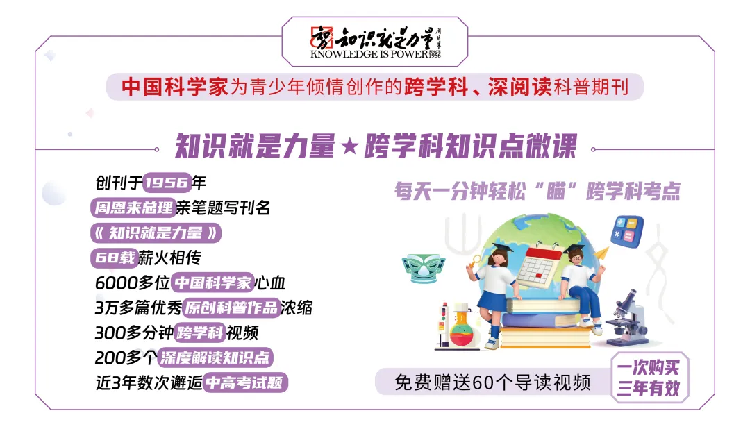 《知识就是力量》 创刊于1956年,周恩来总理亲笔题写刊名,是中国科学家为青少年创作的跨学科、深阅读科普核心期刊,是中国科协面向全国青少年提升科学素养的旗舰品牌。这个品牌凝聚了全球最大规模科研群体的智慧结晶,见证了中国科技创新的蓬勃发展,引领了一代又一代中国人走进科学殿堂,点燃了无数青少年成为未来科学家的梦想。