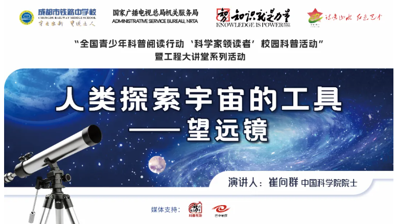 为激发青少年对科学的兴趣,助力科普教育发展,2025年3月28日下午,由《知识就是力量》杂志社、国家广播电视总局机关服务局、成都市铁路中学联合主办的“全国青少年科普阅读行动‘科学家领读者’校园科普活动暨工程大讲堂”在成都铁中新体育馆二楼演艺中心成功举办。《知识就是力量》杂志社社长、主编郭晶,国家广播电视总局机关服务局规划发展处处长朱家玓,成都市铁路中学党委书记胡铃冬、党委副书记兼校长张礼洪等领导出席活动,中国科学院院士、著名天文学家崔向群担任主讲嘉宾,与高一年级的师生们一同开启了一场探索宇宙奥秘的科普之旅。《知识就是力量》科普视听平台、巴中市融媒体现场支持报道。