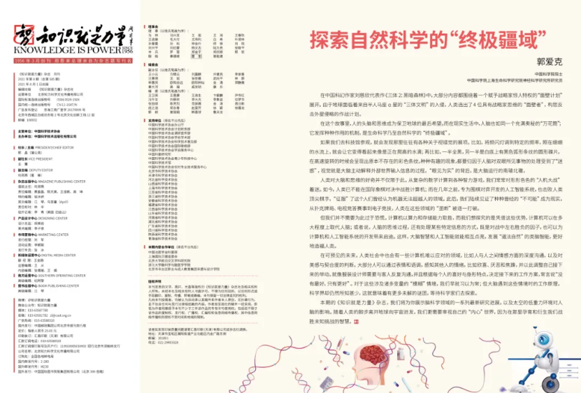 郭院士始终坚信“知识是照亮未来的火炬”,这一理念与《知识就是力量》杂志的科普使命高度契合。作为杂志编委会成员,他不仅以严谨的学术眼光助力内容建设,更亲自提笔为 2021 年 8 月刊撰写卷首语《探索自然科学的 “终极疆域”》。