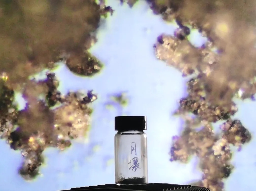 嫦娥五号带回的月壤照片,背景为月壤矿物颗粒的光学显微镜照片(供图/王军强)