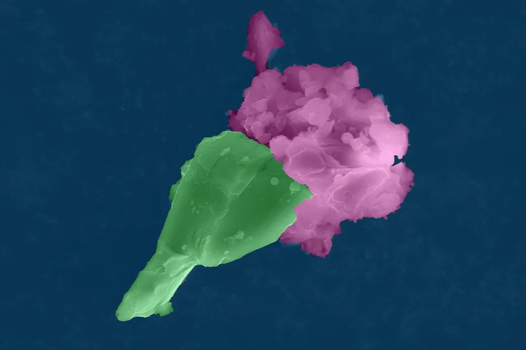 一颗酷似康乃馨的月壤钛铁矿颗粒:绿色部分为钛铁矿,红色部分为胶结质玻璃物质(供图/王军强)