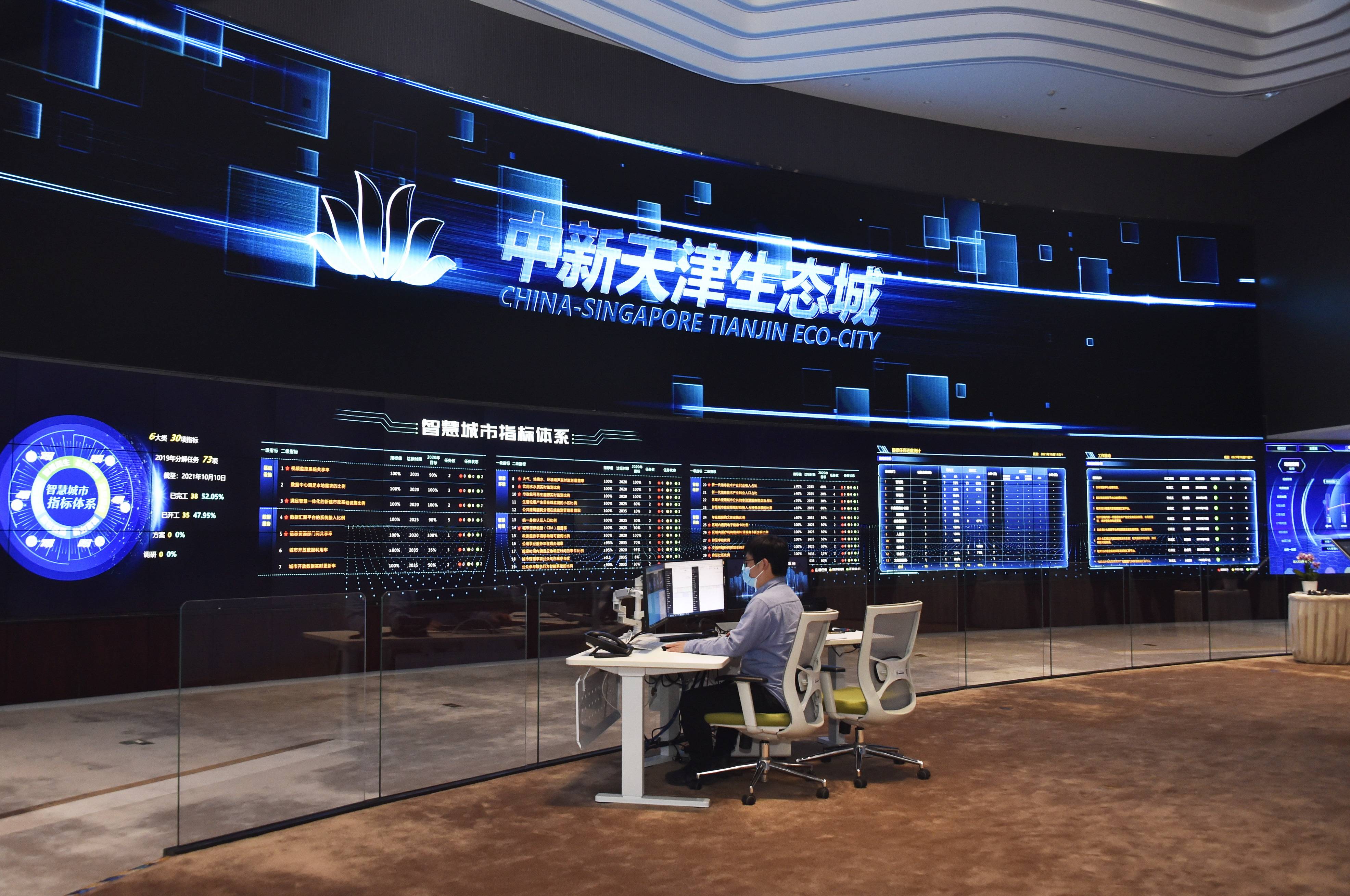 在中新天津生态城“城市大脑”里,建设、环境、能源、教育等19 个领域的信息正在一面超大液晶屏上,“城市大脑”以数字化信息的形式实时呈现,承担着城市日常监测、运行管理和应急调度职责(供图 / 张珑)
