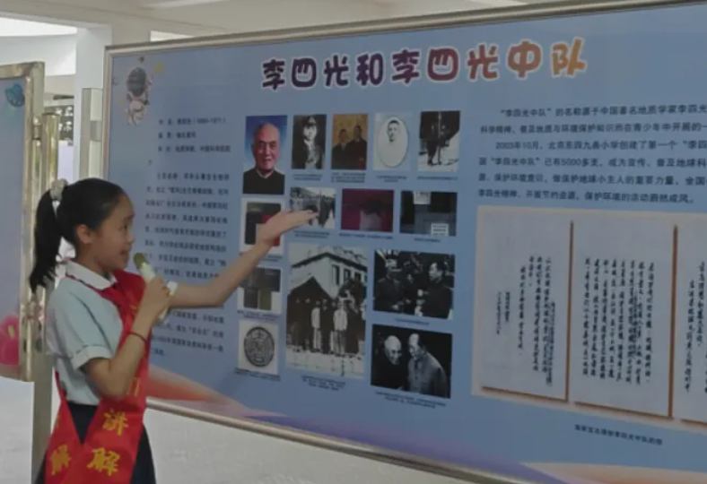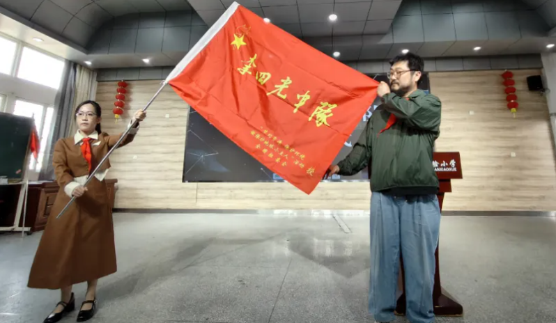 自然资源部宣教中心纪晔宣读“李四光中队”命名决定,并将承载着荣誉与责任的队旗授予四(6)中队。这一授旗激励着队员们以李四光先生为榜样,学习他严谨的科学态度和爱国奉献精神。