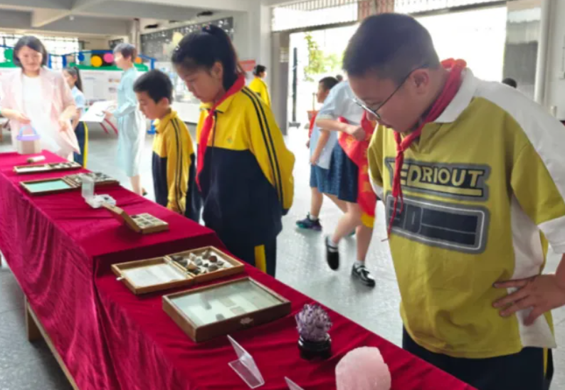 学校小小讲解员引领参会嘉宾参观校园地质科普主题展,丰富详实的展板,以及众多地质标本吸引了同学们驻足观看。