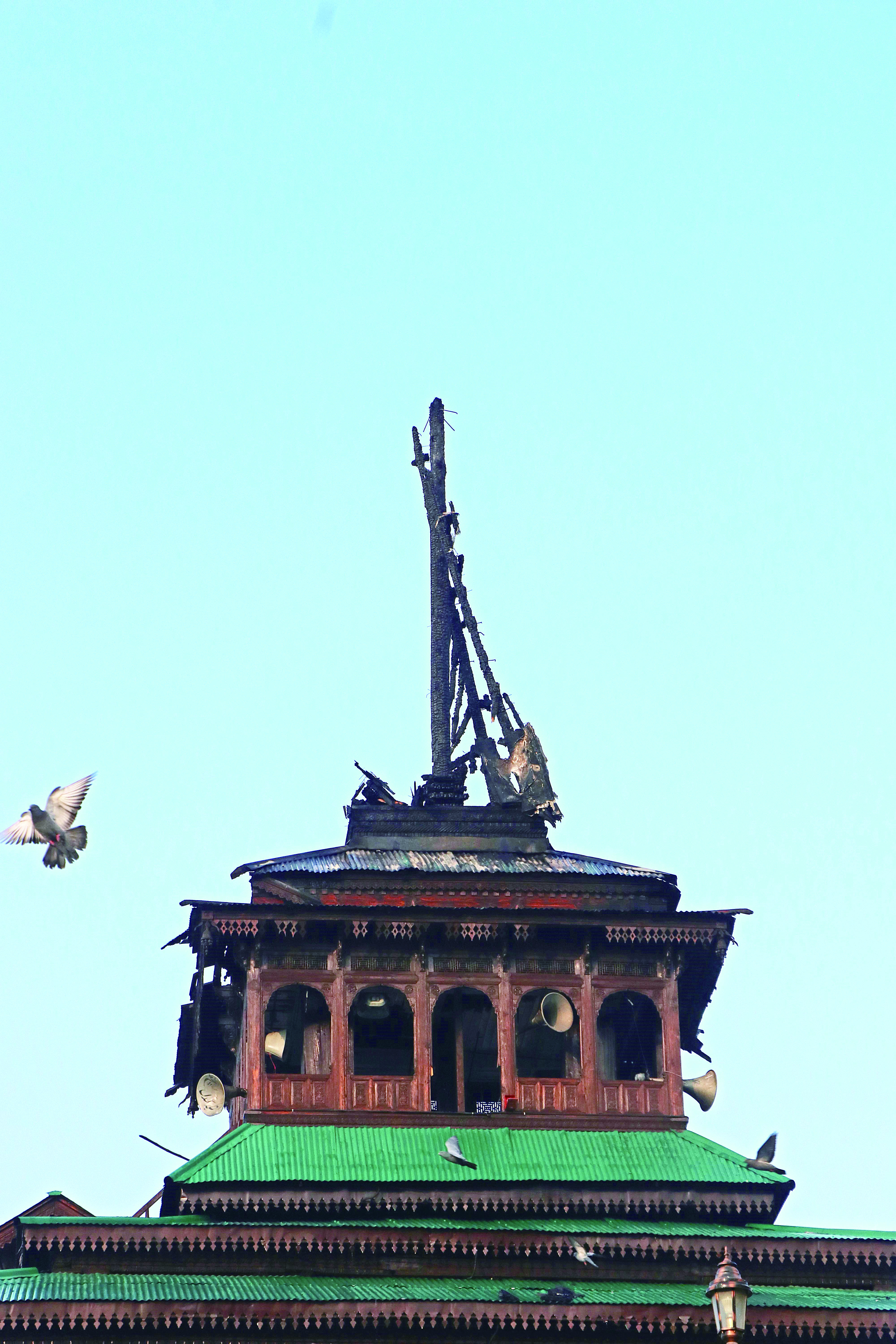 位于南亚西北部的克什米尔地区一座有 300 年历史的清真寺遭雷击,致其顶部受损