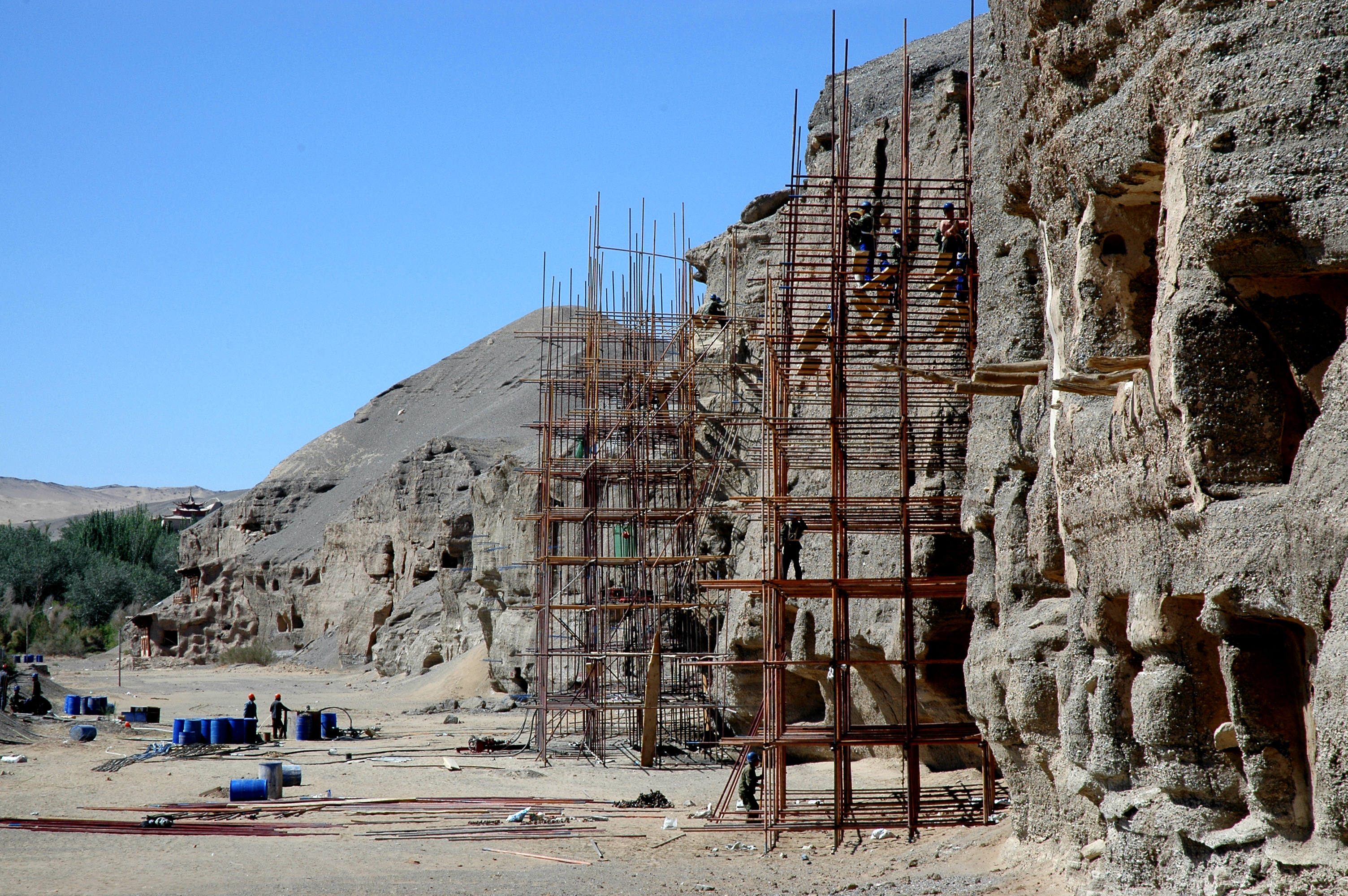 施工人员对敦煌莫高窟进行加固