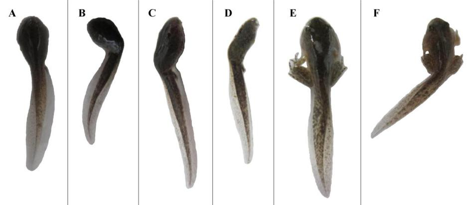 水中微量的有机磷农药残留会导致中国林蛙卵孵化中出现大量畸形情况,主要表现为尾部强直性弯曲、骨骼畸形、身体轴线弯曲及前肢缺失