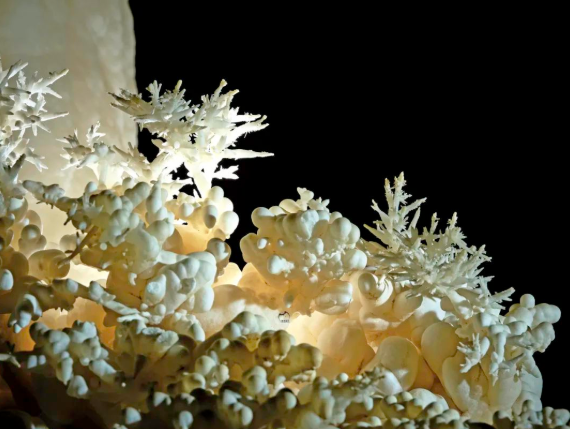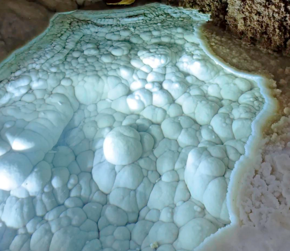 非重力水的 “空中织锦” :表面张力让水汽在洞壁凝结成针状文石花,池水沉积则用纯净碳酸钙 “浇铸” 云朵石,水质经地层过滤后,晶体透明度堪比钻石。