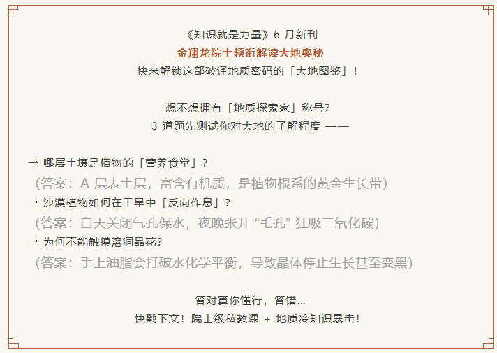 “地球表层的每一寸土壤,都是亿万年地质与生命共舞的活化石。” 本期《知识就是力量》聚焦土壤与地质的层叠奥秘 —— 当东北黑土的腐殖质层遇见贵州溶洞的方解石晶花,当沙漠植被在极端环境中演绎碳汇奇迹,我们得以透过 “大地的千层糕” 与 “地下水晶宫” ,读懂地球 46 亿年演化的密码。