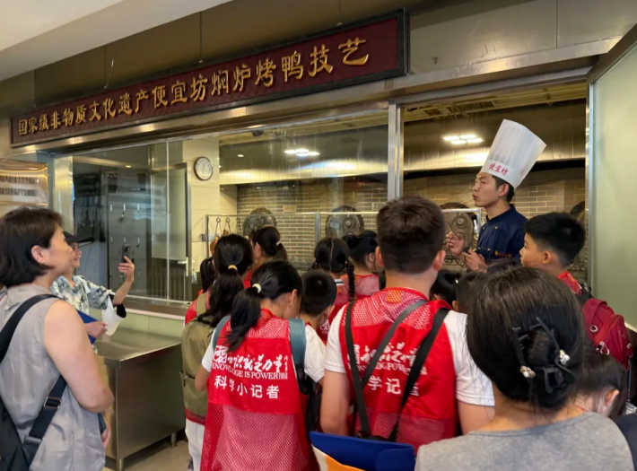 科学小记者们认真学习了关于烤鸭的知识,了解到烤鸭分为挂炉烤鸭和焖炉烤鸭两种类型。焖炉烤鸭以砖炉焖烤,不见明火,皮脆肉嫩且油润鲜美;挂炉烤鸭用果木明火悬烤,表皮更酥脆并带有果香。