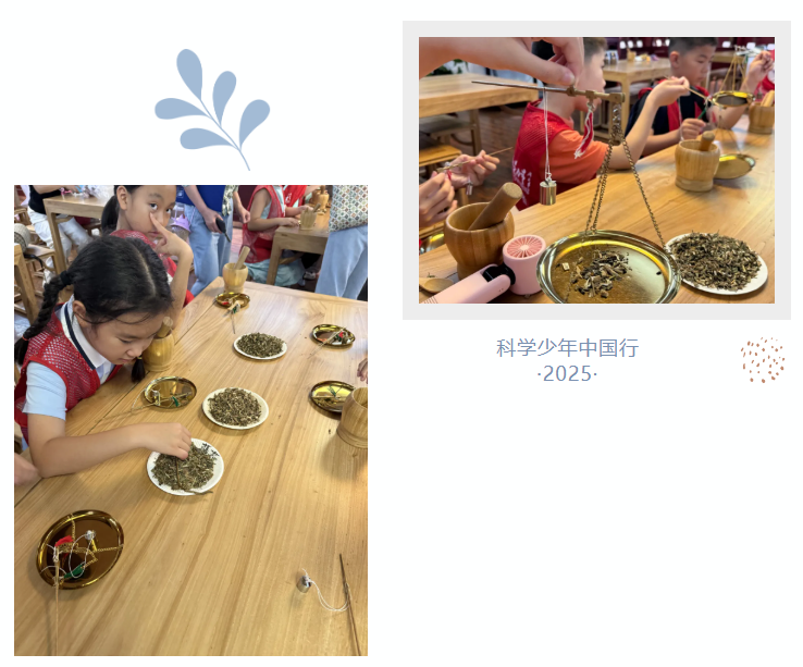 在此次体验中,科学小记者们制作香囊的材料有以下三种:藿香,具有祛暑化湿的作用;薄荷,气味清爽,其中的挥发成分能刺激皮肤和黏膜的冷觉感受器,产生清凉感,同时通过促进汗腺分泌,增加散热,从而起到解热降温的作用。其中的有效成分薄荷醇,具有抗炎作用,能够抑制炎症介质的释放,减轻炎症反应的同时还具有一定的镇痛效果;佩兰,能有效化解体内湿浊之气,使用佩兰可以改善食欲不振、口中黏腻等症状。除此之外,小记者们还学习使用中药房常见的测量工具戥子称来量取制作香囊所需药材的剂量。
