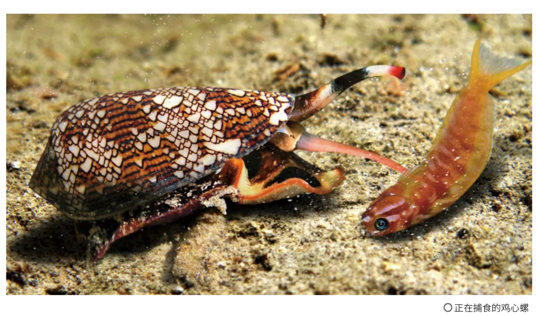 鸡心螺行动时慢得跟普通蜗牛一样,而它们的食物——小金鱼速度却很快,鸡心螺之所以能轻易击杀猎物,这要归功于鸡心螺的“暗器功夫”——注射毒液。