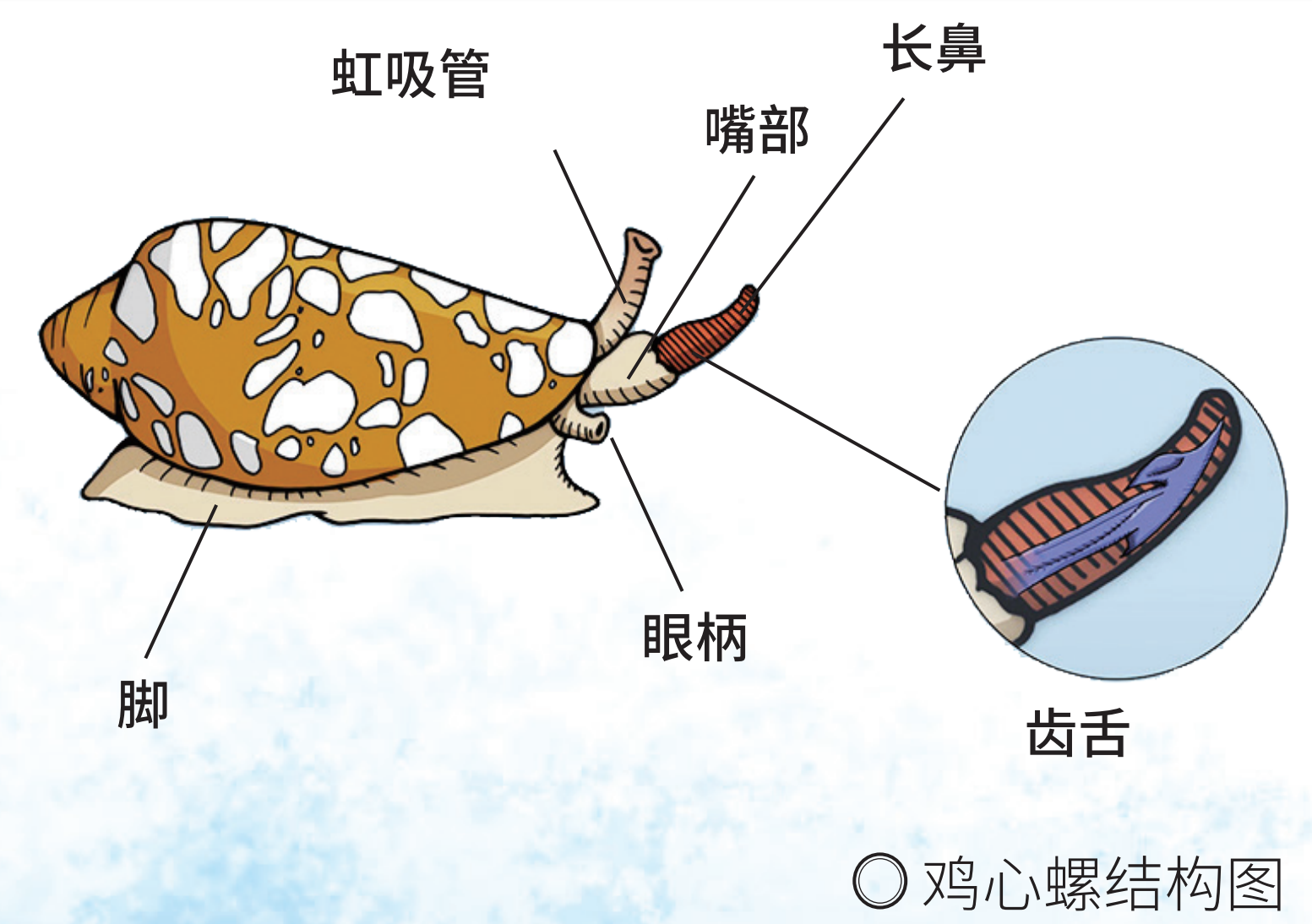鸡心螺头部的橘色东西像一个舌头,称为长鼻,用来跟踪和制服毫无防备的鱼,它的毒液不只是单一成分的物质,而是一种有毒分子的混合物,由一颗叫作“齿舌”(类似人类打针用的针头)的伪齿携带并加以释放。