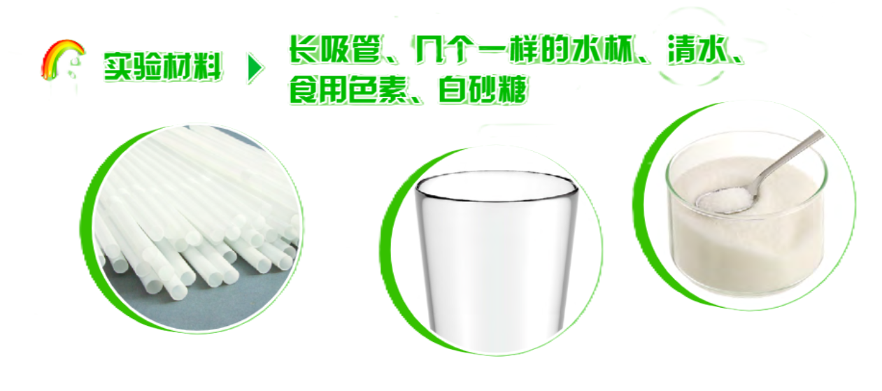 一场大雨之后,你常常能看到跨越苍穹的美丽彩虹。今天我们一起来看一场“不一样的彩虹”,还能了解密度和大气压强的相关知识,就让我们一起动手,做一道想看就看的吸管彩虹吧!实验步骤01将几个水杯一字排开,每一个水杯都注入相同量的清水。然后,用食用色素将水杯中的水依次染色,越接
