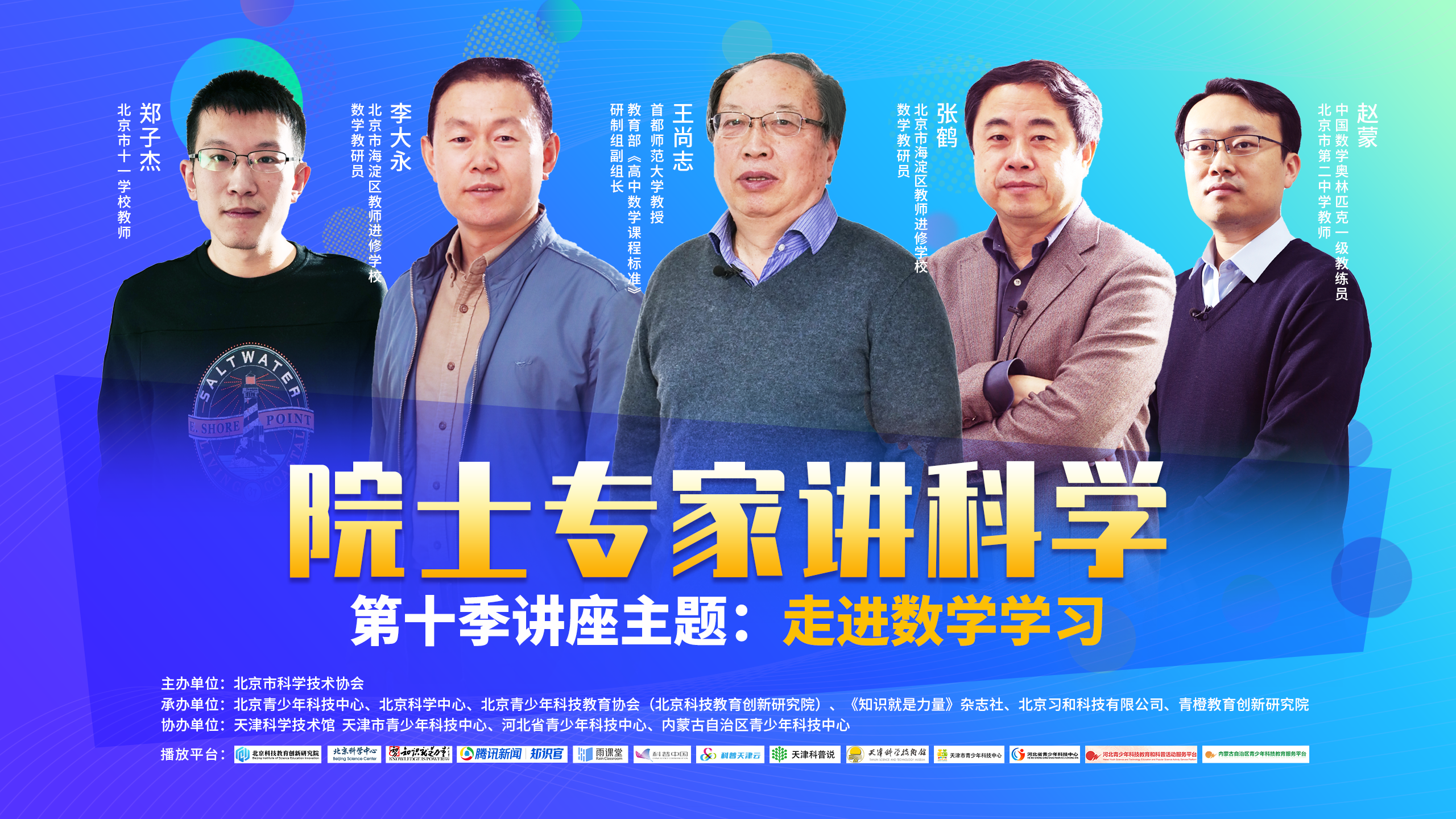 2020年12月9日“院士专家讲科学”第十季邀请到了教育部《高中数学课程标准》研制组副组长北京市海淀区教师进修学校教研员以及北京二中青年教师(中国数学奥林匹克一级教练员)北京市十一学校优秀教师带领大家一起走进数学学习