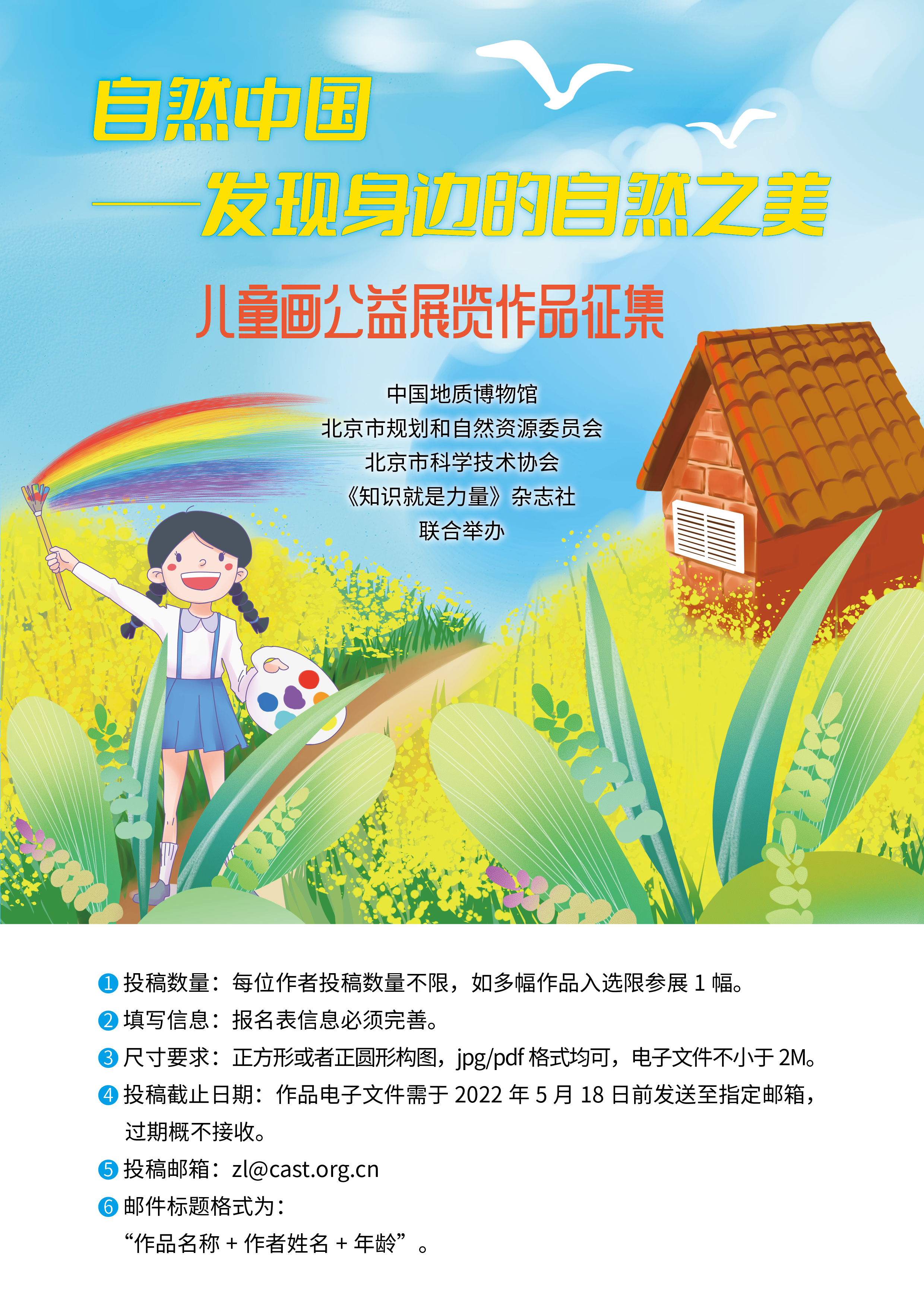 为深入贯彻落实习近平生态文明思想,提高社会公众的节约资源、保护环境意识,中国地质博物馆、北京市规划和自然资源委员会、北京市科学技术协会、《知识就是力量》杂志社将于2022年6月1日国际儿童节之际联合举办儿童画公益展览,旨在以“祖国的未来”为重要群体,宣传人与自然