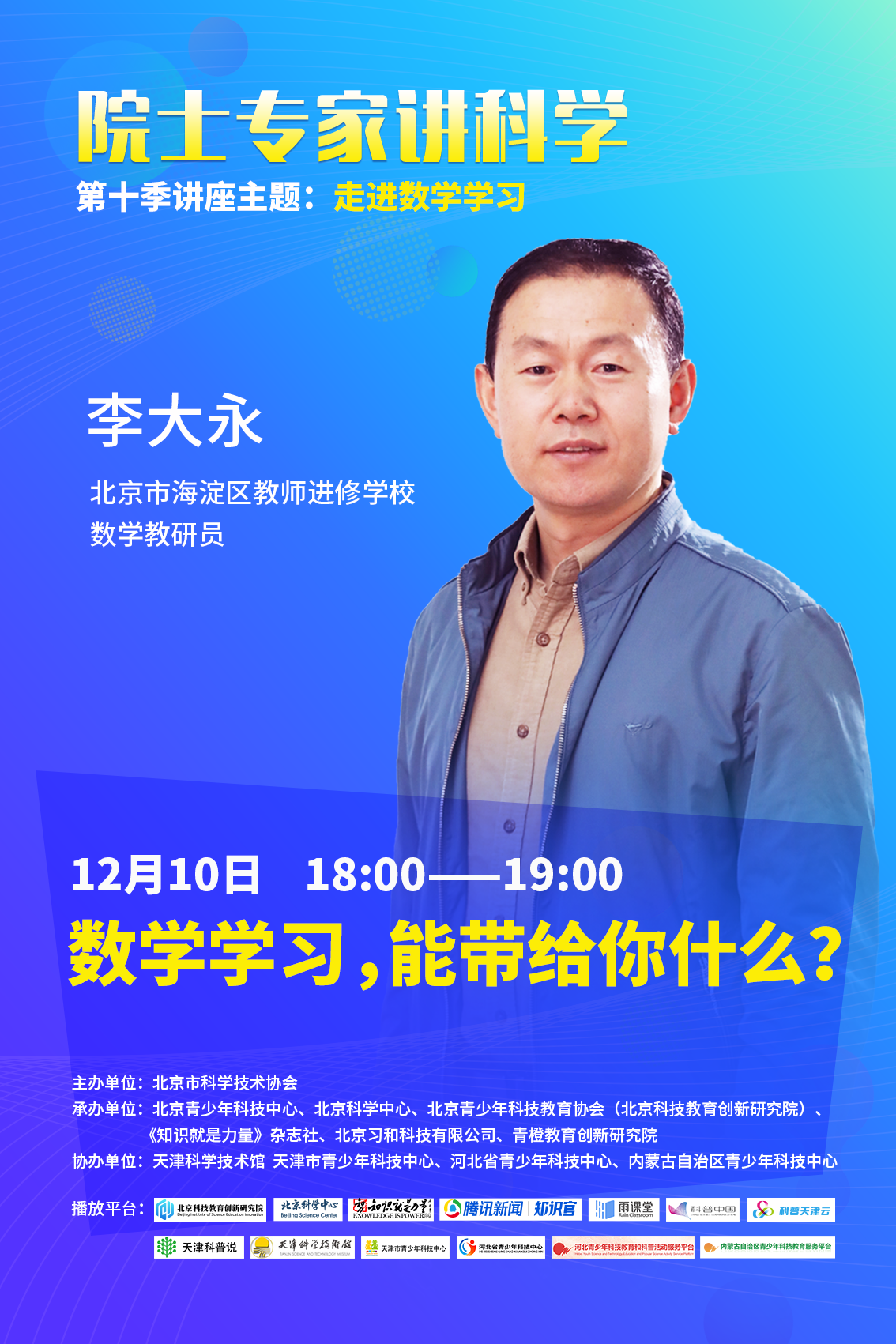 主讲人:李大永,现任职于海淀区进修学校数学教研员,中学特级教师,北京市数学学科带头人,国培计划专家库第三批入选