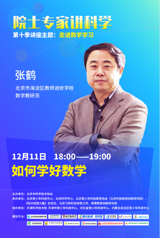 学好数学的目的是培养我们的数学的思维能力,要学好数学,就要勤动脑,学会用数学的思维方法理解并解决你所要解决的数学问题。如何学会数学的思维?那请关注本期讲座——海淀区进修学校数学教研员张鹤老师为大家带来的数学科普讲座《如何学好数学》。