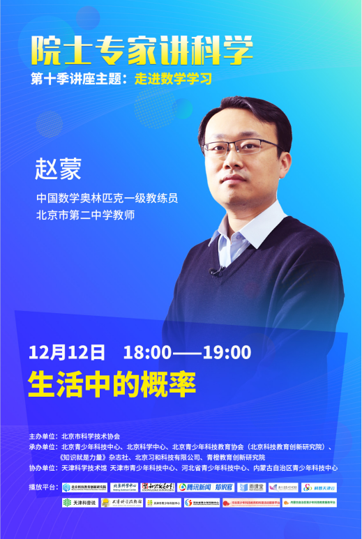 概率论就是研究随机现象数量规律的数学分支。生活中,很多问题都可以用概率论进行解释。那在我们的生活中,有哪些事情可以用概率来解释呢?请大家关注本期讲座——北京市第二中学优秀教师、中国数学奥林匹克一级教练员赵蒙老师为大家带来的数学科普讲座《如何学好数学》。
